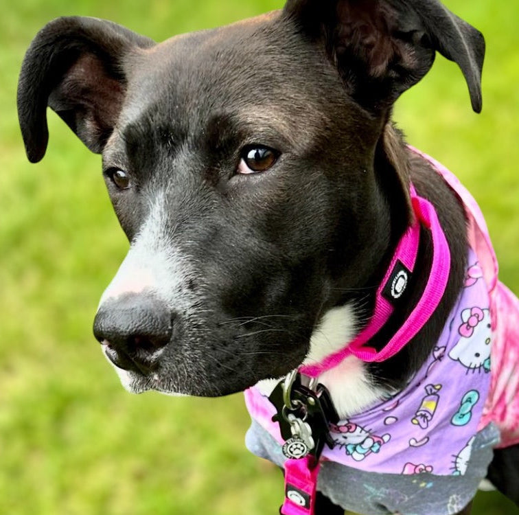The quality of this collar is top notch from the buckle to the way it’s made it’s got a comfortable neoprene padded liner and beautiful vibrant pink exterior that’s sewen with care and quality I also love the emergency handle if it’s needed